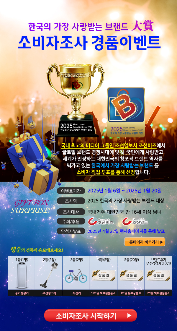 2025 한국의 가장 사랑받는 브랜드를 가리기 위한 소비자 설문 이벤트를 진행합니다.
